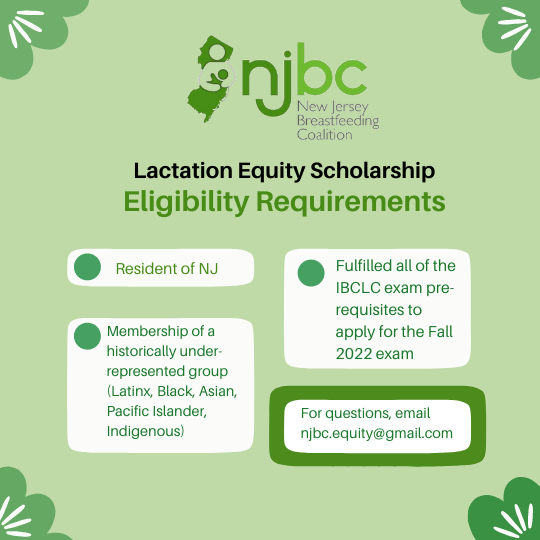 To help eliminate the disparities in the professional lactation field, the New Jersey Breastfeeding Coalition is excited to offer Lactation Equity Scholarships to historically under-represented (Black, Latinx, Asian-American, Native Hawaiian, Pacific Islander, Indigenous) IBCLC candidates who live in New Jersey to cover the cost of the IBCLC exam.