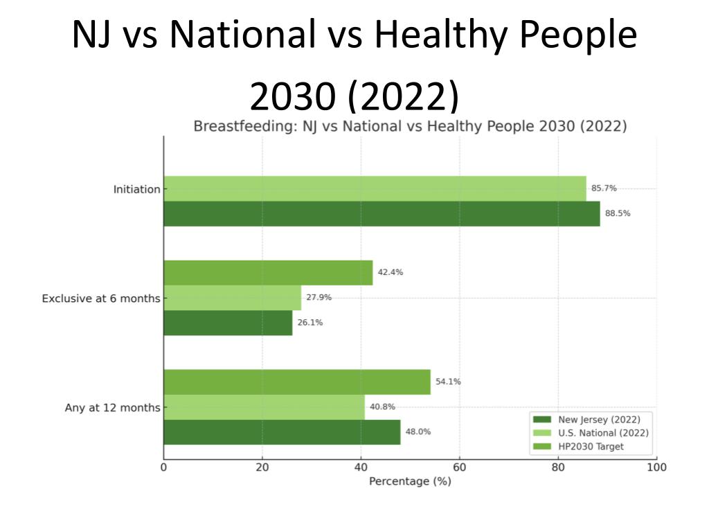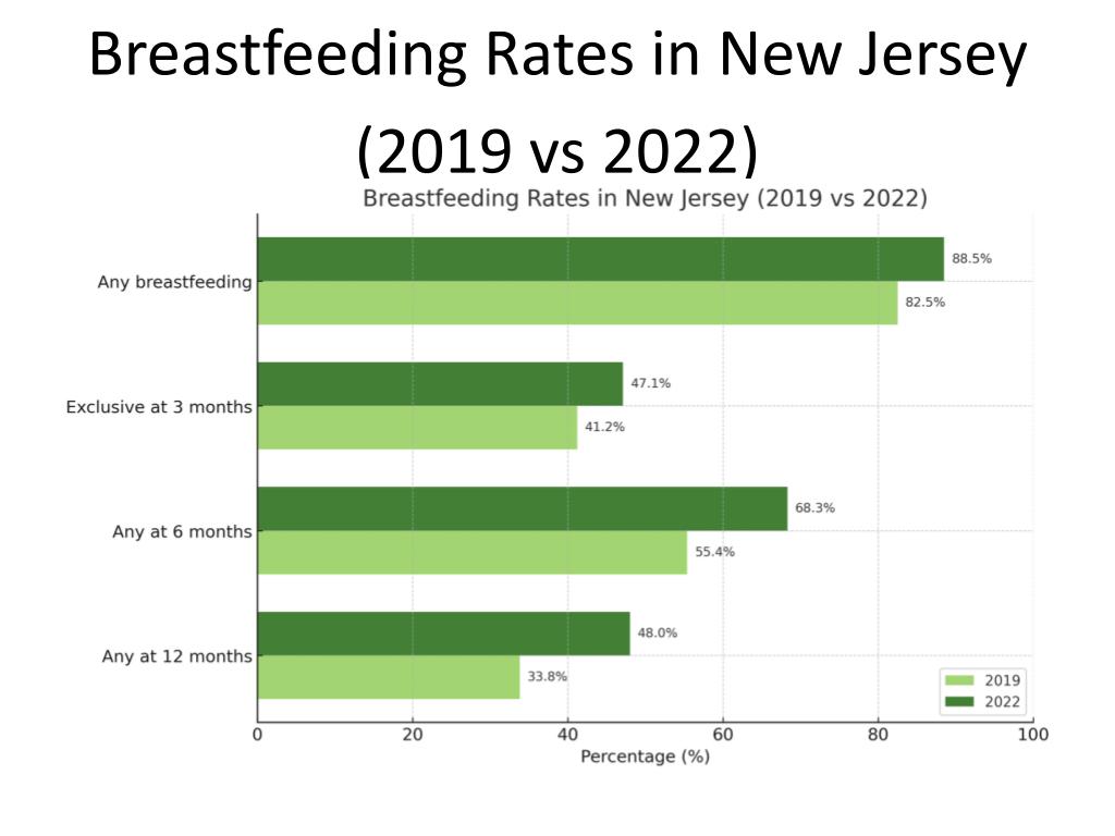 The data from CDC and Healthy People 2030 shows that New Jersey has made notable progress in breastfeeding rates between 2019 and 2022, especially in initiation and continuation through the first year.