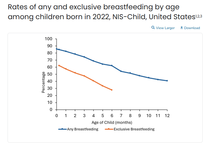 - Rates of Any and Exclusive Breastfeeding by Sociodemographics: https://www.cdc.gov/breastfeeding-data/modules/2022-rates-any-exclusive-bf-socio-dem.html