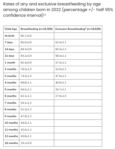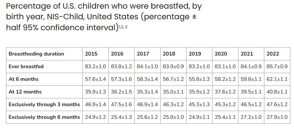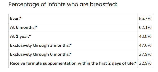 - Rates of Any and Exclusive Breastfeeding: https://www.cdc.gov/breastfeeding-data/modules/2022-rates-any-exclusive-bf-state.htm