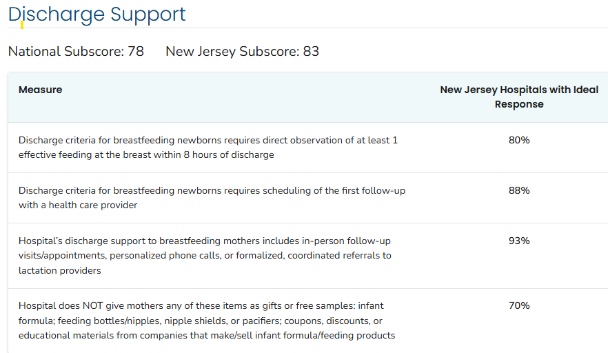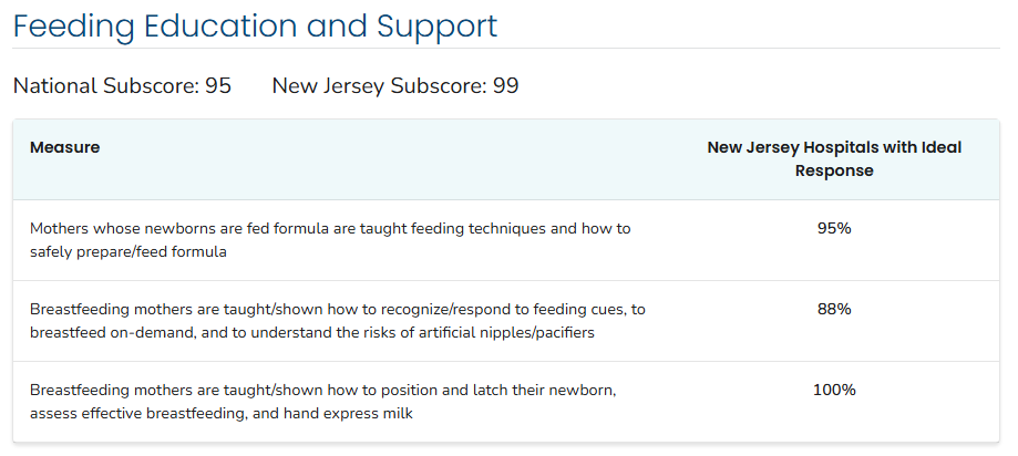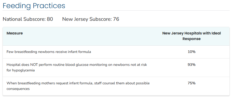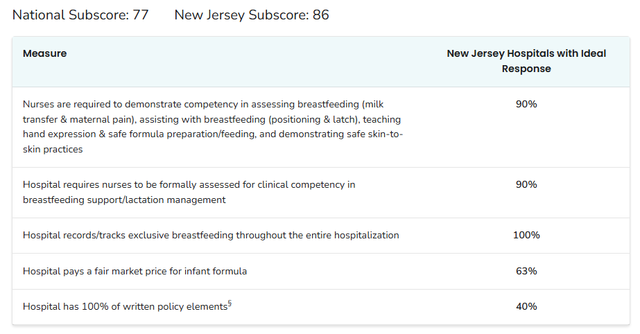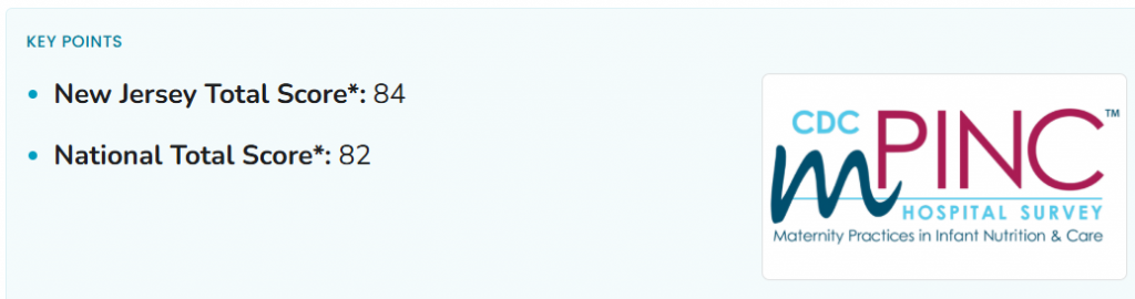 - New Jersey most recent mPINC data (Data collected by the CDC on NJ hospital practices): https://www.cdc.gov/breastfeeding-data/mpinc/state-reports.html#NJ