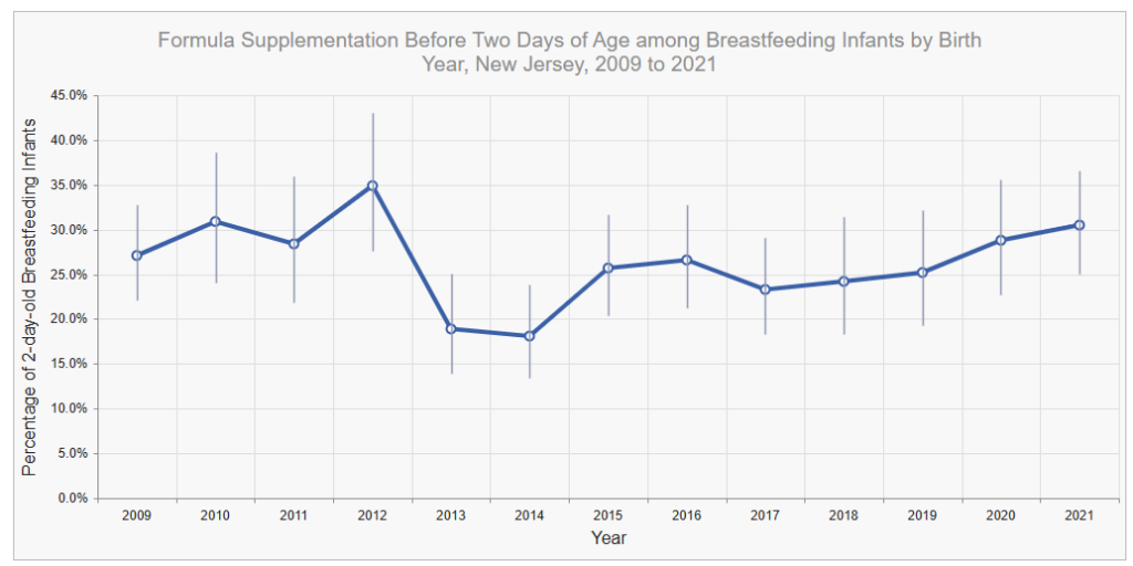 - Search for formula supplementation among breastfed babies, feeding at discharge, and births at baby-friendly facilities: https://www-doh.nj.gov/doh-shad/indicator/summary/Feeding.html