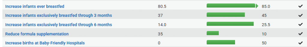 | Initiation of breastfeeding | Exclusive at 3 months | Any at 6 months | Any at 12 months | |