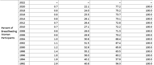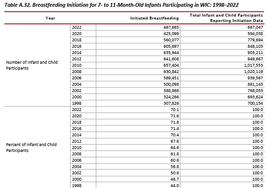Source: Huret, N., Zvavitch, P., Beckerman-Hsu, J., Perez-Zetune, V., Reischmann, P., & Calvin, K. (2023). WIC Participant and Program Characteristics 2022. U.S. Department of Agriculture, Food and Nutrition Service. For more information on breastfeeding initiation rates, see chapter 8 of the report.