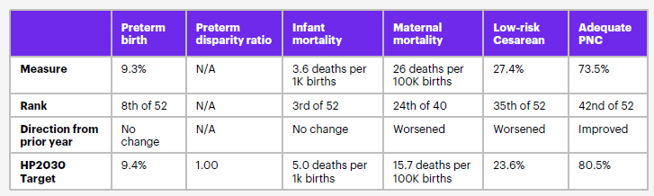 Note: All policies were assessed on October 15, 2024. Adequate PNC measure differs from inadequate PNC. Adequate is presented here to align with Healthy People 2030 target. Ranks are determined for all states with available data with 1 being the best.